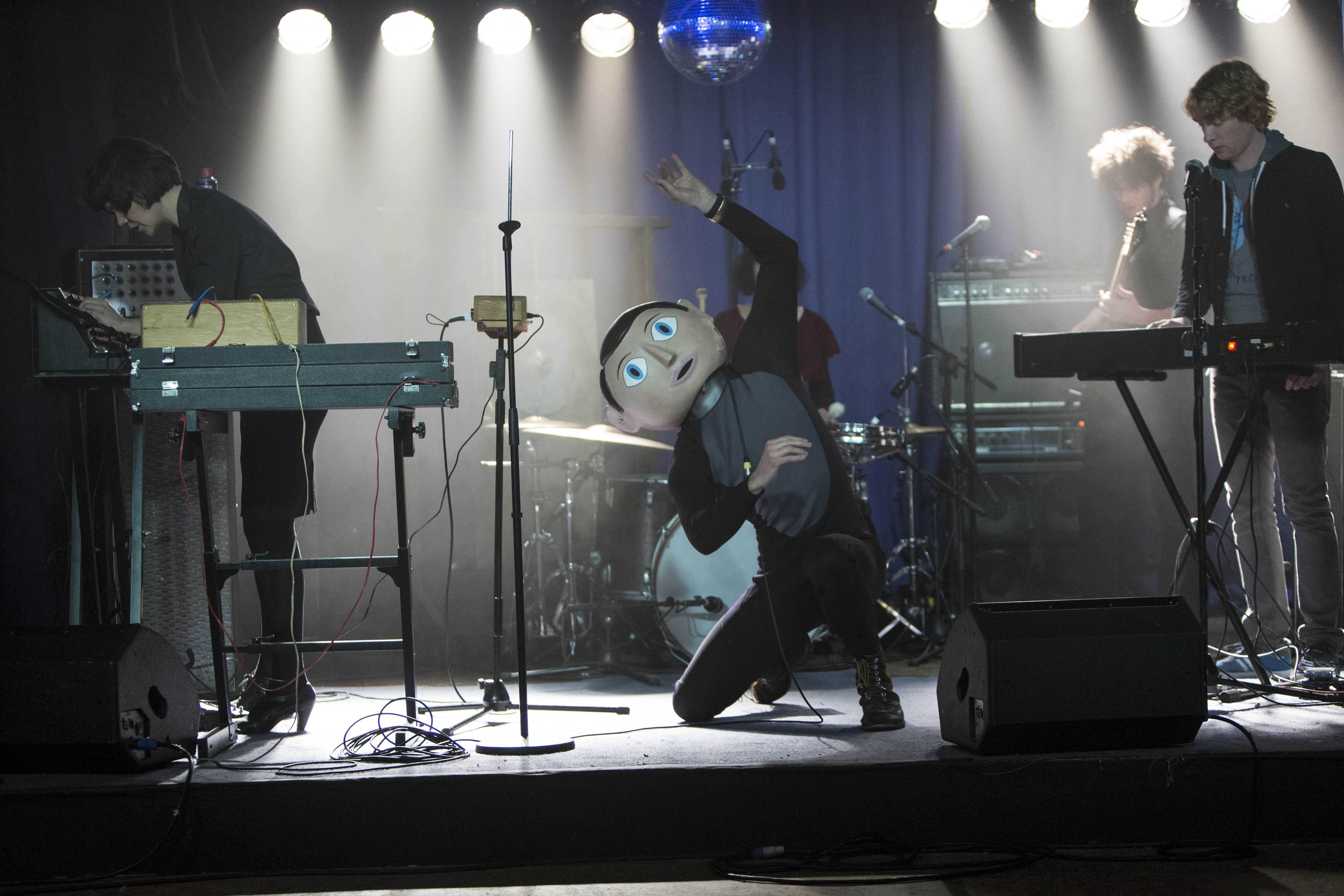 Pour Jon (Domhnall Gleeson), l’opportunité d’échapper à sa vie banale survient lorsqu’il assiste à la maladroite tentative de suicide du claviériste des Soronprfbs. Le gérant des musiciens, Don (Scoot McNairy), invite spontanément Jon à jouer avec eux, sans demander d’audition. Le jeune banlieusard se ramasse alors sur scène, puis dans une cabine éloignée en Irlande, et enfin à un réputé festival américain, parmi une bande d’éclectiques personnages. Au centre de ceux-ci : Frank (Michael Fassbender, pour autant qu’on sache), chanteur charismatique et loufoque qui porte en tout temps un imposant masque sphérique aux yeux bleus écarquillés et à la bouche entrouverte. L’arrivée de Jon, qui pousse la formation à flirter avec la célébrité, menace particulièrement la relation codépendante entre le prodige éponyme et sa proche collaboratrice Clara (Maggie Gyllenhaal).