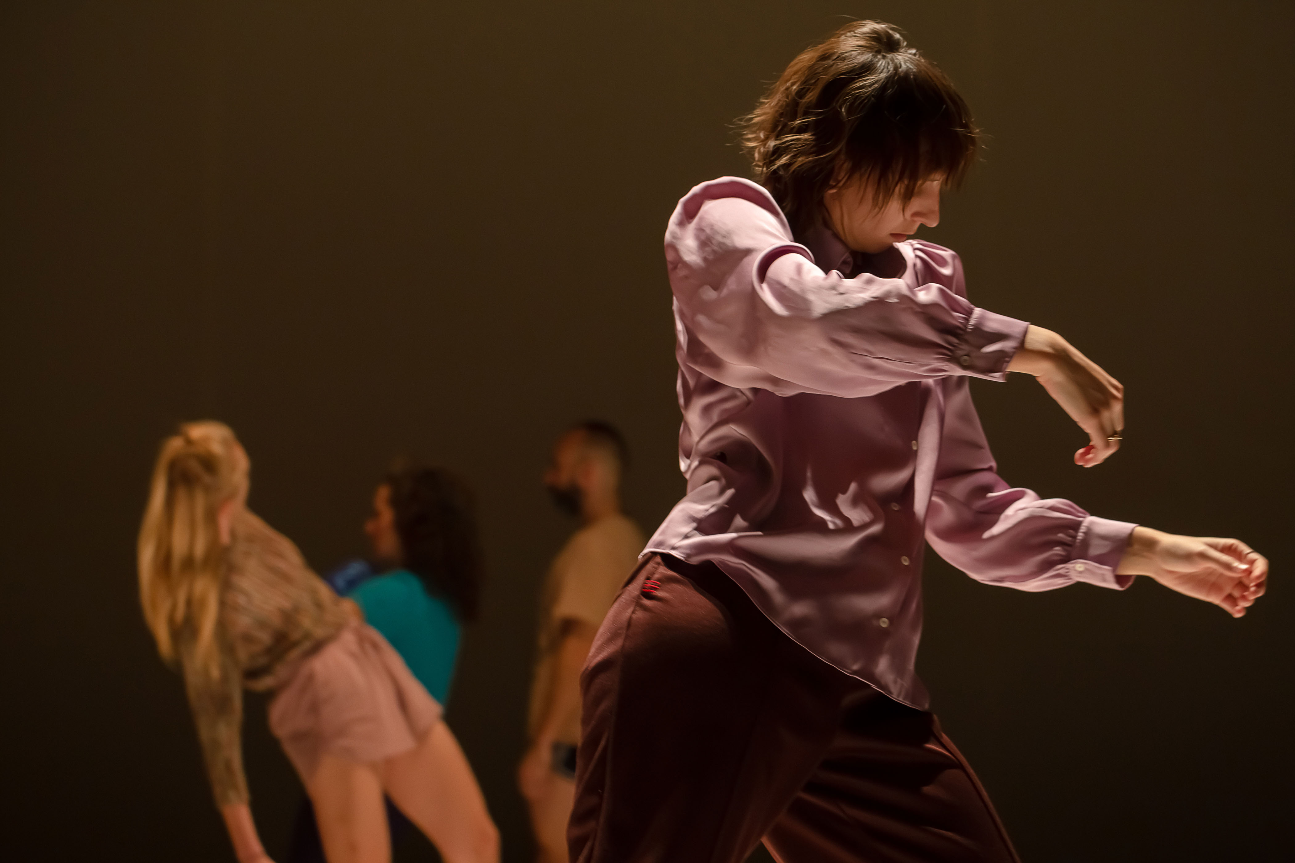 Dès les premiers instants du spectacle, les interprètes Élise Bergeron, Rosie Constant, James Phillips et Marilyne St-Sauveur tracent des figures rondes sur les planches immaculées, sous une auréole lumineuse qui fait office de soleil. Ils battent la cadence à l’unisson, le visage quasi imperturbable, simplement rougi par l’effort, sans se toucher ni même prendre conscience de l’existence de l’autre. Puis, au fil des déplacements rotatifs, ils prennent leur envol, s’affirment dans leur unicité, s’attirent et se repoussent. Étoiles ou humains, leur trajectoire de vie est parsemée de rencontres avec des acolytes qu’ils croisent, imitent, soutiennent, abandonnent. Entre ces brèves réunions, les danseurs mettent et enlèvent des accessoires et des pièces de vêtements disposés tout autour de la scène. Leur personnalité se moule à ces costumes. Certaines étoffes briment la liberté d’esquisser des gestes, alors que les chaussures modifient la façon de se mouvoir dans l’espace.