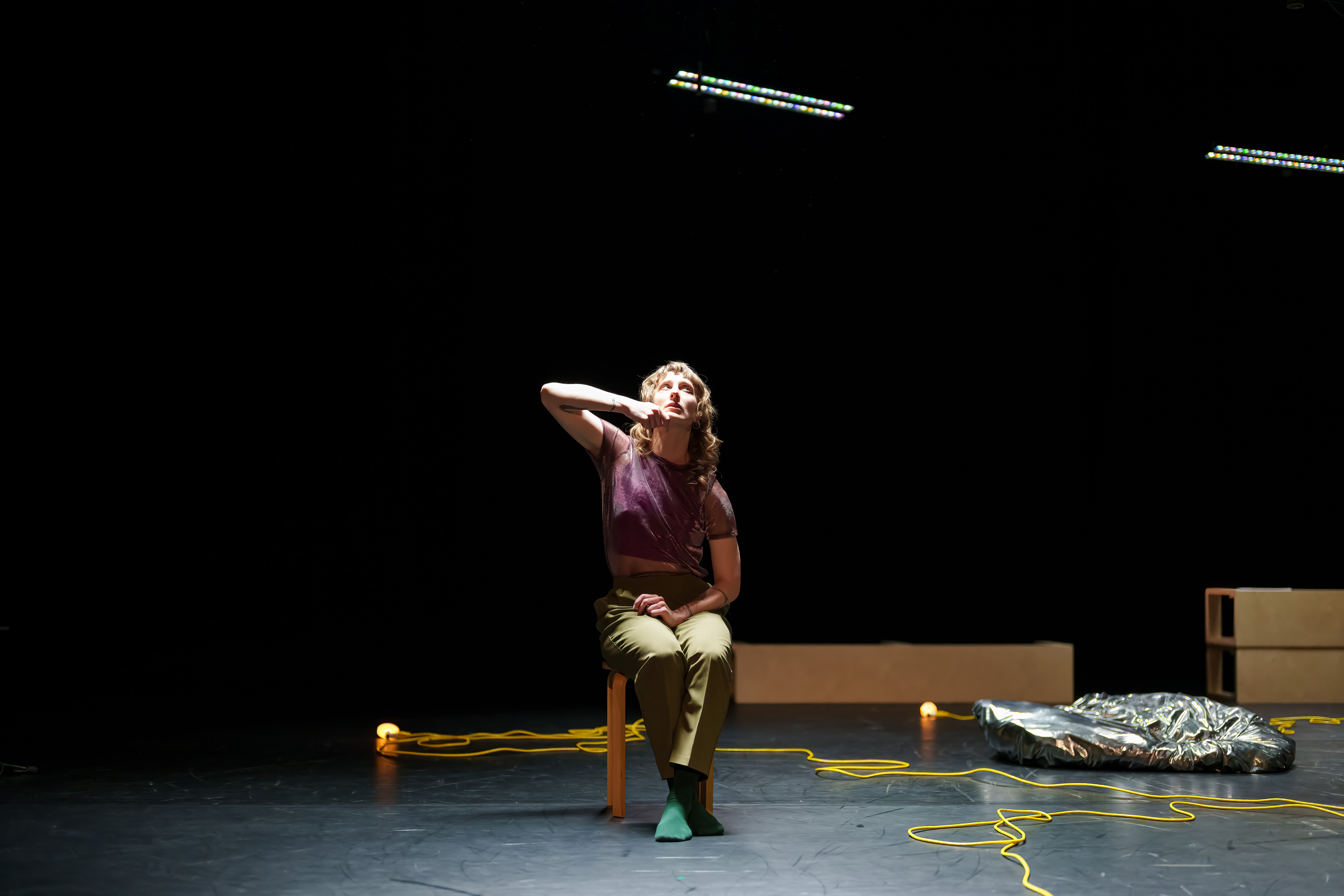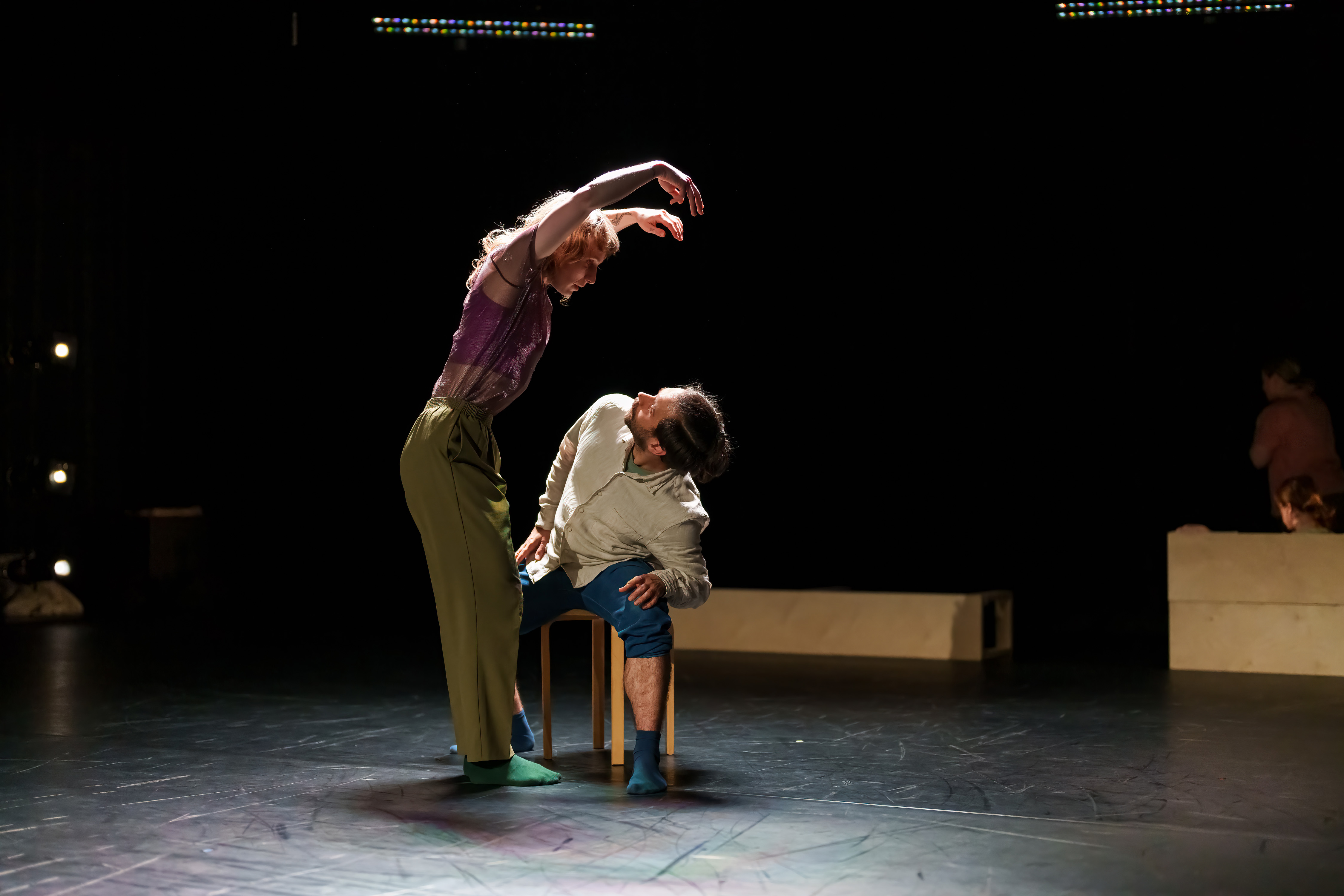 Juste avant la représentation, on a eu le privilège d’assister à une des activités inspirées par les recherches des scientifiques Stefanie Blain-Moraes et Naila Kuhlmann. Un petit capteur attaché à notre doigt, pour enregistrer les données de notre système nerveux, on s’est laissé guider par les directives de l’animateur Marco Pronovost. Après quelques profondes respirations, on a été invité à explorer et développer une connexion avec un autre participant à l’atelier, en improvisant des mouvements. Puis, les chercheuses ont analysé les chiffres recueillis, en plus de nous en dire davantage sur leurs travaux. Passionnantes, leurs études ont notamment permis d’observer chez des patients atteints de démence des réactions physiques à l’autre, comme si le corps conservait des souvenirs de rencontres passées que l’esprit a oubliées.