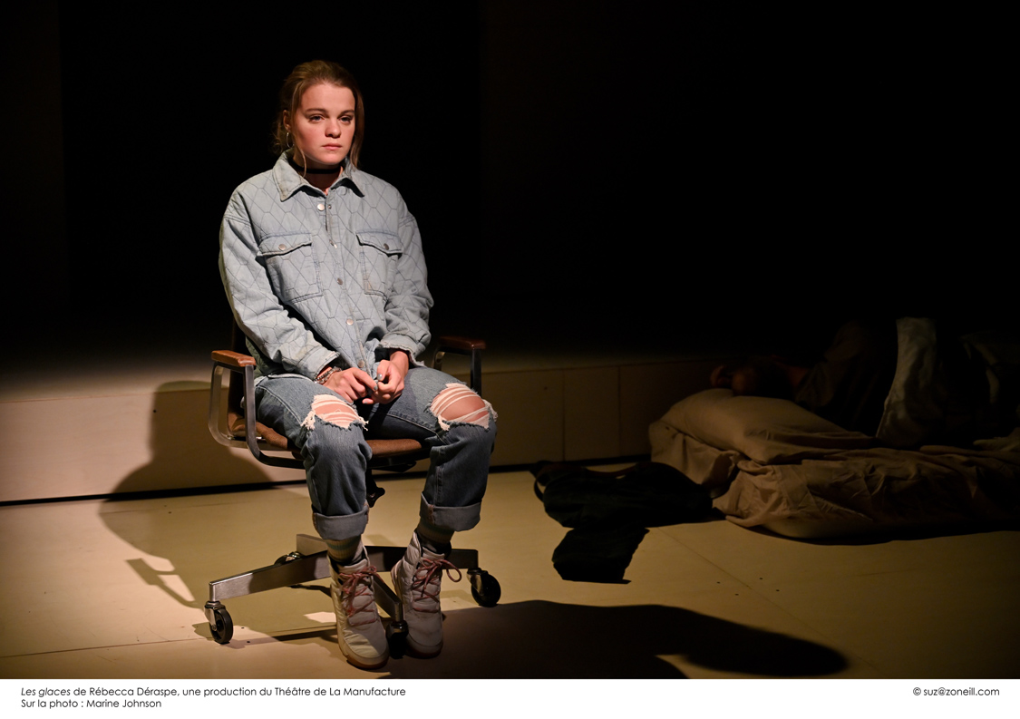 Les Glaces, de Rébecca Déraspe, mise en scène par Maryse Lapierre, est présentée du 4 octobre au 5 novembre 2022, au Théâtre La Licorne, à Montréal, puis du 23 au 26 novembre 2022, au Théâtre Alphonse-Desjardins, à Repentigny, le 1er décembre 2022 au Centre culturel Berger, à Rivière-du-Loup, et du 10 janvier au 4 février 2023 au Théâtre La Bordée, à Québec.