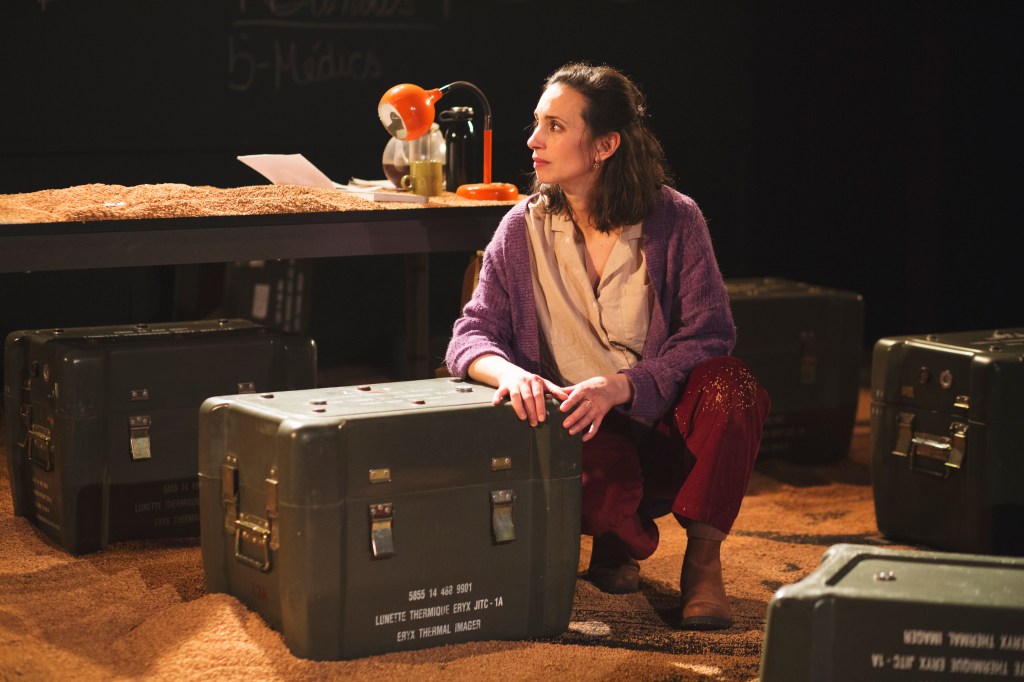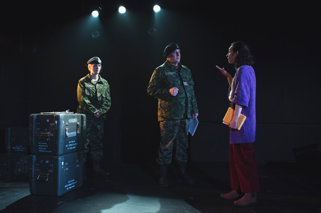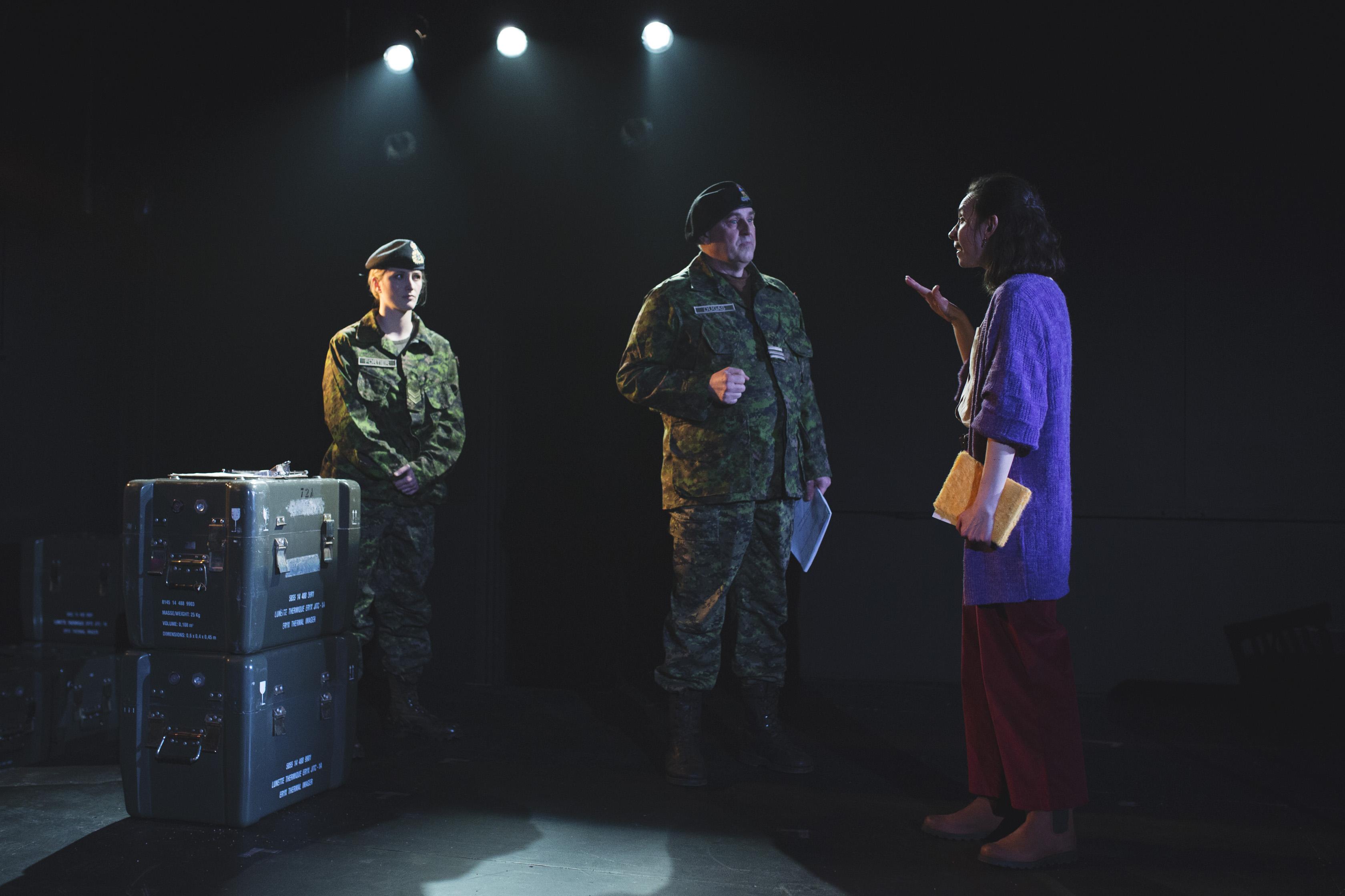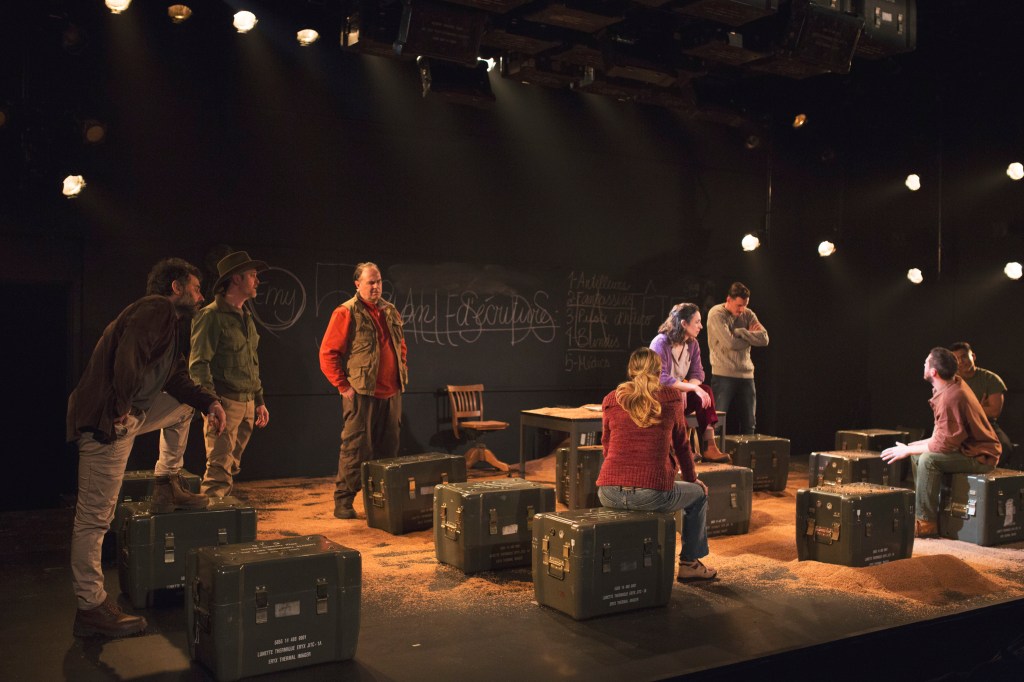 La mise en scène de François Bernier est fort intelligente. Aussi comédien dans le spectacle (il remplace Éric Robidoux, de la première mouture), il dirige ses collègues interprètes avec précision et sensibilité. La distribution offre une performance juste, intense, avec la bonne dose de retenue. En alter ego de la dramaturge Roxanne Bouchard, Sylvie De Morais-Nogueira propose un personnage qui porte, en quelque sorte, les préjugés et questions que peut avoir le public. Elle est aussi convaincante qu’énergique. De son côté, Joakim Robillard incarne avec un charisme indéniable l’un des militaires, un être coloré et par moments hilarants. Quant à Lou Vincent-Desrosiers, elle brille dans l’une des scènes les plus marquantes de la pièce, dans laquelle Amy raconte l’explosion qui a pulvérisé le char qu’occupaient ses ami·e·s.